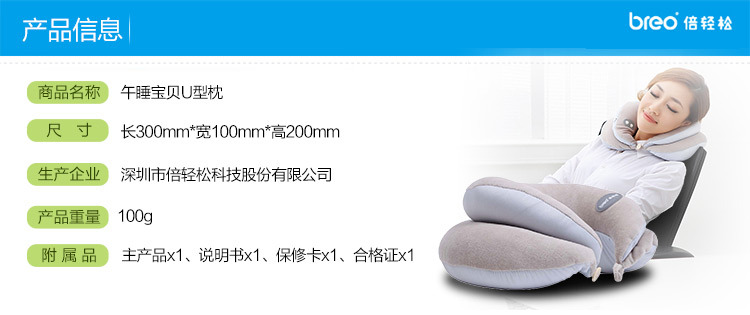 【商品名称】: 午睡宝贝U型枕【品牌名称】: breo/倍轻松【商品型号】: U型枕【商品介绍】:泡沫颗粒、办公室休息使用【适用人群】: 不限【外形尺寸】:约长300mm×宽100mm×高200mm【商品重量】:约100g【电源】:无需电源【产地】:深圳【生产企业】: 深圳市倍轻松科技股份有限公司