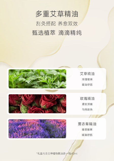 ◆搭配甄选植萃艾草、薰衣草、玫瑰3种精油,多倍好材量,刮灸搭配养愈双效深层呵护;