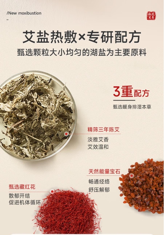 ◆配方加持,内含天然晾晒藏青盐、活血藏红花、舒缓锁温碧玺、以及三年陈艾绒