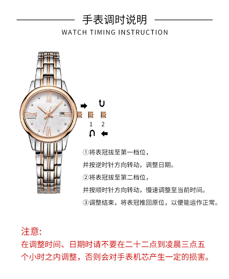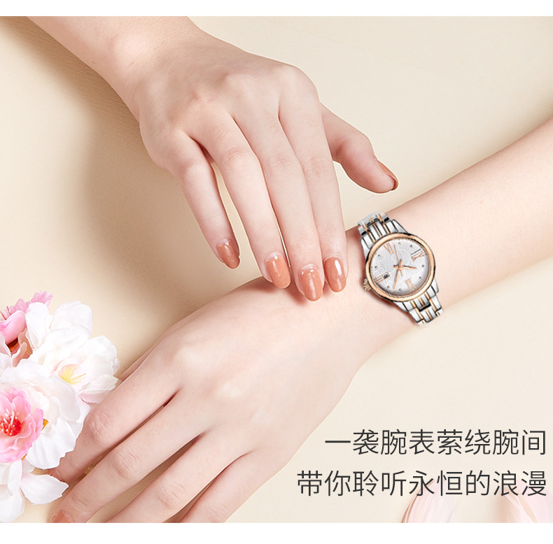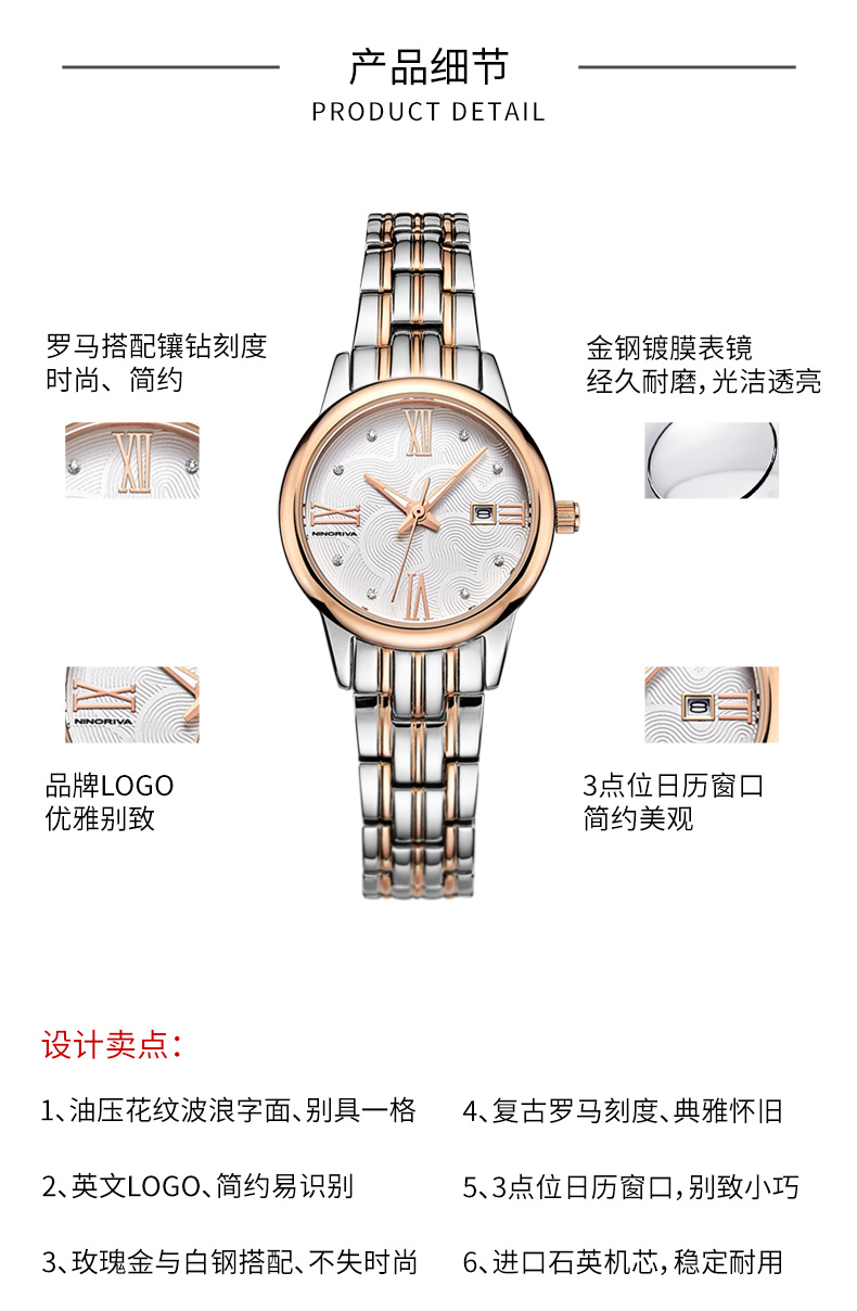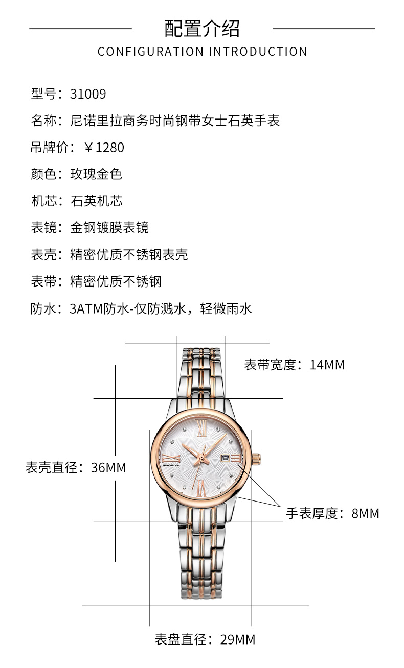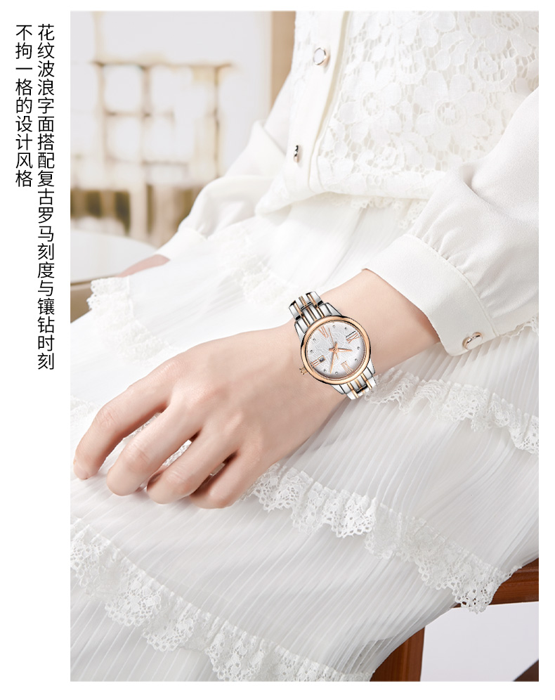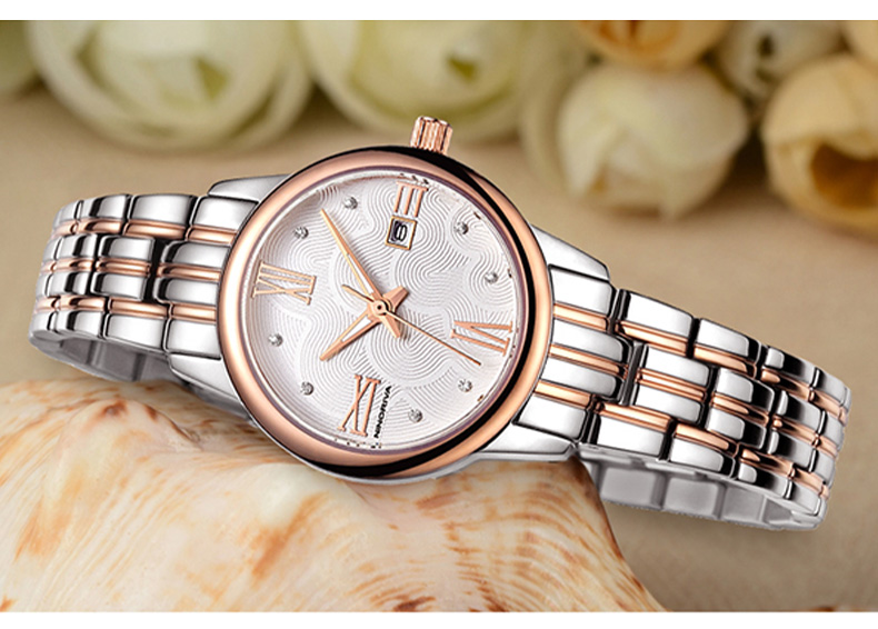 尼诺里拉 商务时尚钢带女士石英手表 玫瑰金色钢带